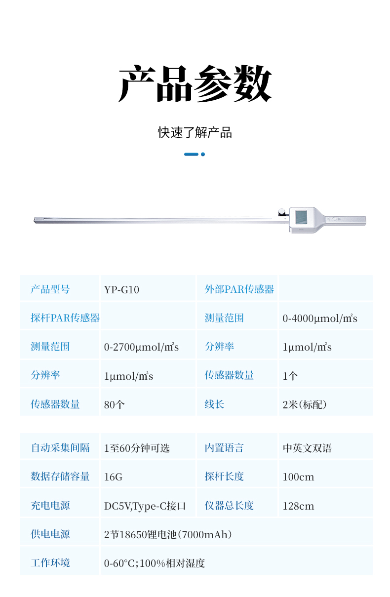 YP-G10植物冠層測量儀可廣泛應用于農業生產和農業科研,為進行冠層光能資源調查,測量植物冠層中光線的攔截,研究作物的生長發育、產量品質與光能利用間的關系,本儀器用于400nm-700nm波段內的光合有效輻射(PAR)測量、記錄,測量值的單位是平方米·秒上的微摩爾(μmol㎡/秒)。